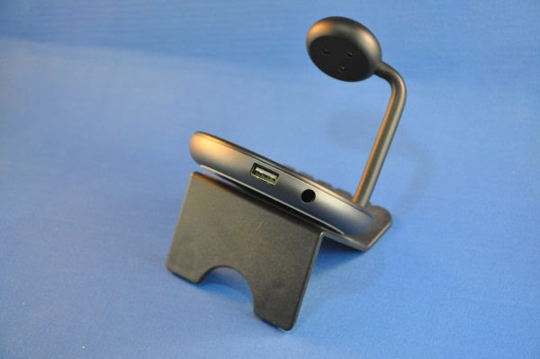 The stand is disarming in its simplicity. It’s a disc almost 4″ in diameter, with a space gray plastic finish and black plastic accents. There is a simple company logo centered on the disc. The 5/8″ thick base has a rubber gasket on the bottom to keep it firmly on your desk or nightstand. A metal tube almost 1/4″ in diameter rises just over three inches from the base, and curves gently to a position centered over the base. The charging puck is affixed to a metal holder set at a permanent 29º angle. The holder is smooth and nicely rounded. The fittings between the puck holder, the tube, and the base are both smooth and tight. There is no play at all.