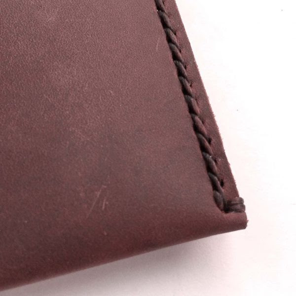 Above, the stitching along the back.As mentioned above, this wallet has a fairly slim footprint, which helps keep its overall size down.